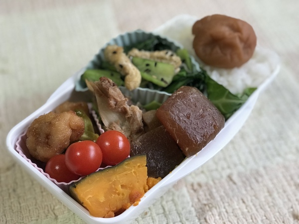 ブリ大根、カボチャ、小松菜とジャコの和え物、南高梅