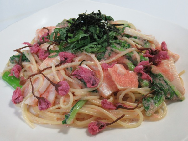 今日の麺料理「桜と菜の花とたけのこの明太クリームパスタ」です