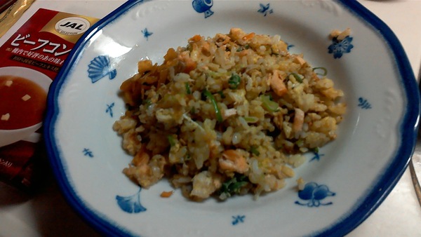 焼きジャケほぐしてカニチャーハンの素少しだけ入れて白だしと醤油と最後にバターと白ワイン入れて( ゚Д゚)ウマー