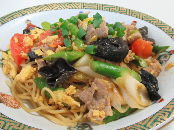 今日の麺料理は「きくらげとトマトの卵炒めのせ焼きそば」です