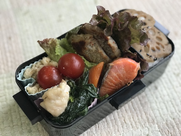 焼き鮭、焼き豚、蓮根のキンピラ、タラモサラダ、ハンペンと小松菜の煮物