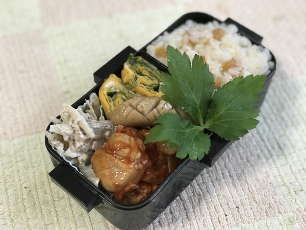 梅ご飯、三つ葉の玉子焼き、ゴボウサラダ