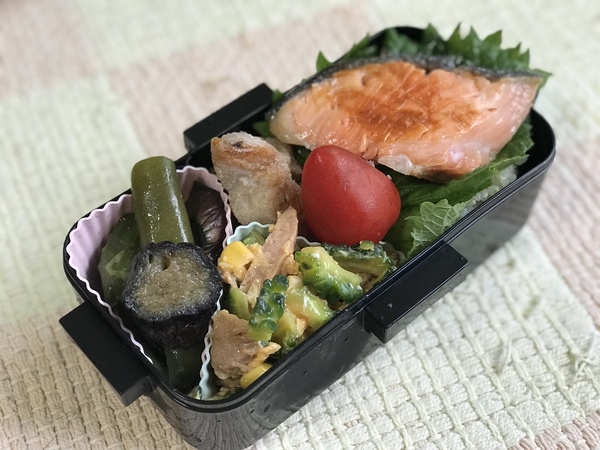 焼き鮭、ゴーヤチャンプルー、ピーマンとナスの煮物、鶏の胡椒焼き