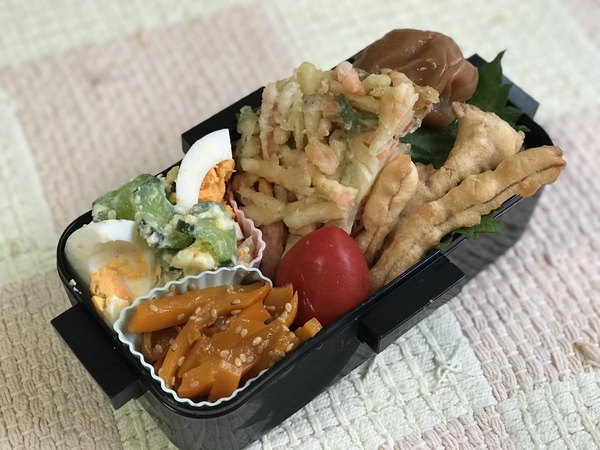 野菜のかき揚げ、ポテチサラダ、コリンキーのきんぴら