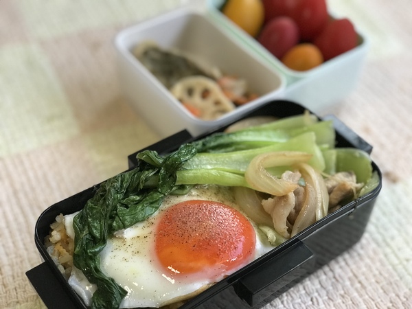 玄米炒飯目玉焼き青梗菜乗っけ弁当