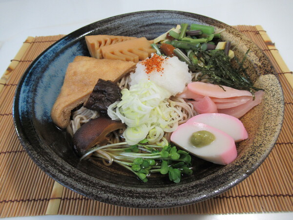 今日の麺料理は「冷やし山菜きつね蕎麦」です