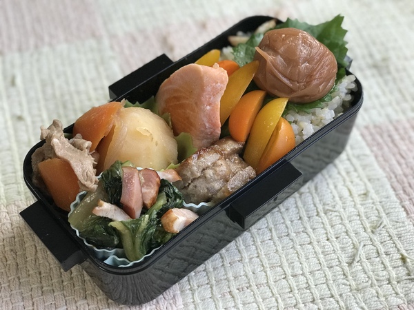 肉じゃが、ロメインレタスのベーコン炒め、塩ざけ