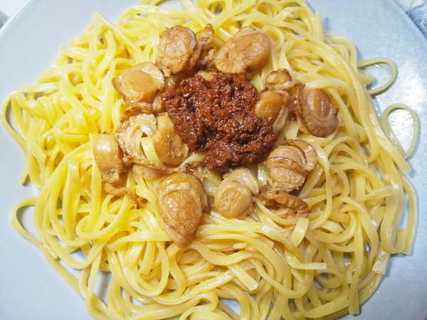 ベビー帆立の燻製オイル漬けとドライトマトスプレットのパスタ