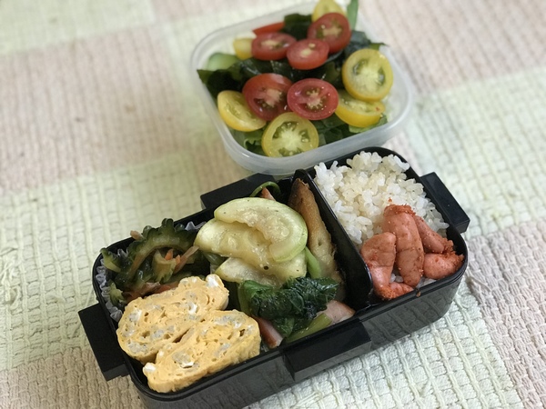 雑魚入り卵焼き、小松菜、ズッキーニのベーコンソテー