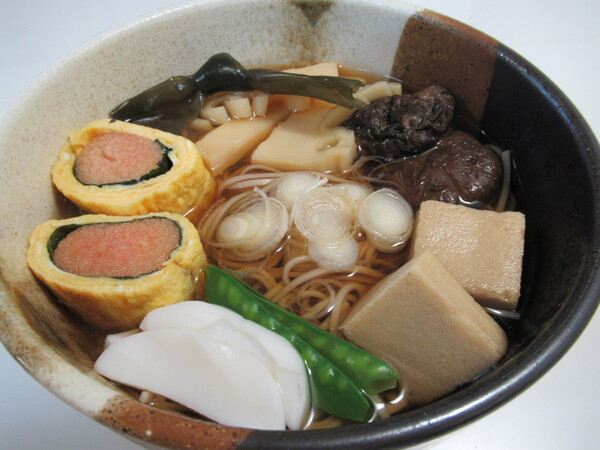 今日の麺料理は暖かいお蕎麦「明太卵焼きと含め煮のお蕎麦」です