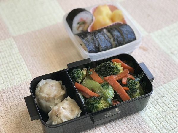 昨日の恵方巻き、焼売、ブロッコリー、セロリ、人参、ウィンナーのオイスターソース炒め。