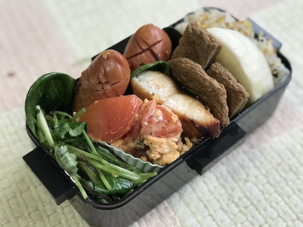三つ葉のおひたし、トマ玉炒め、塩鯖、ウィンナー