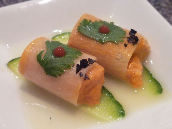 新鮮な生うにを大根のカツラで巻いて頂きます。