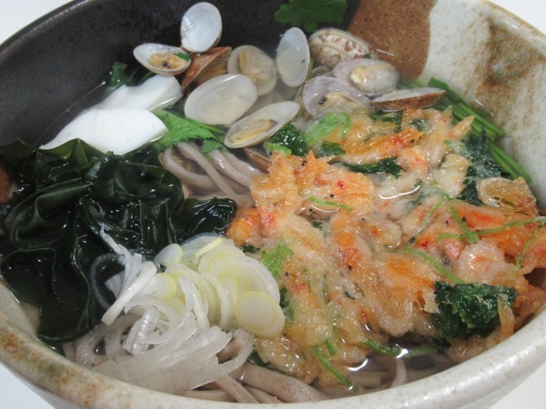 今日の麺料理は「桜えびのかき揚げとあさりの蕎麦」です