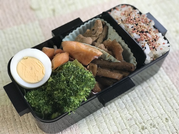 ホルモン煮、ブロッコリーのおかか和え、ゴボウのたたき、塩鮭