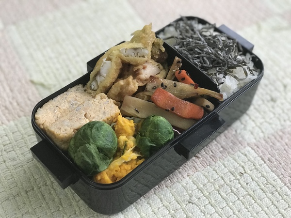 カボチャと芽キャベツのサラダ、シラス入り卵焼き、ブロッコリーの茎きんぴら