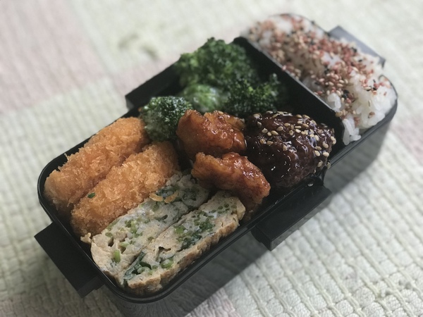 海老カツ、三つ葉の卵焼き、ブロッコリー、肉団子