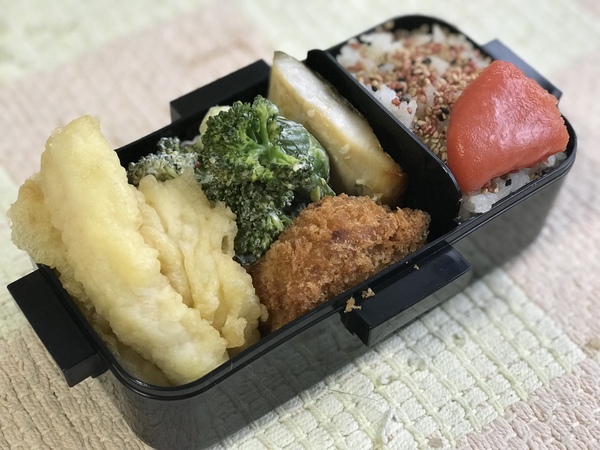烏賊の天ぷら、ブロッコリーと芽キャベツのサラダ、牛肉コロッケ、塩サバ