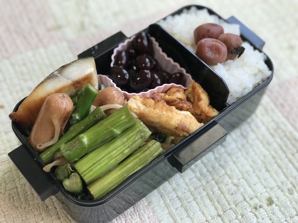アスパラ、ウィンナー炒め、黒豆、塩鯖、玉子焼き