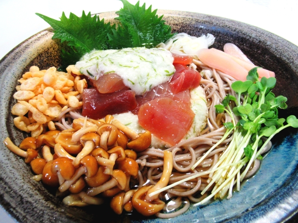 今日の麺料理は「漬けマグロのめかぶ山かけ蕎麦」です