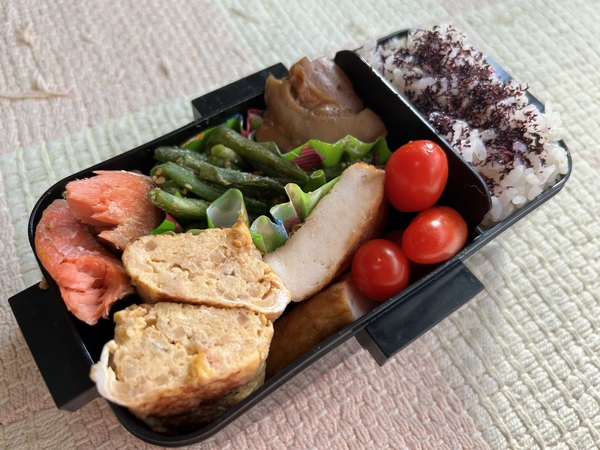 玉子焼き、はんぺんのバター醤油焼き、インゲンの胡麻和え