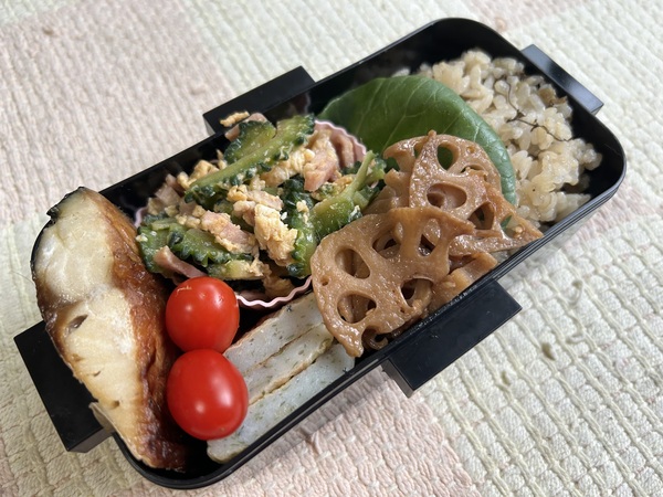 ゴーヤチャンプルー、蓮根のきんぴら、塩鯖