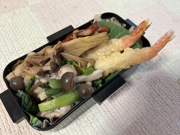 海老天、筍ソテー、チキンと小松菜の塩バター炒め