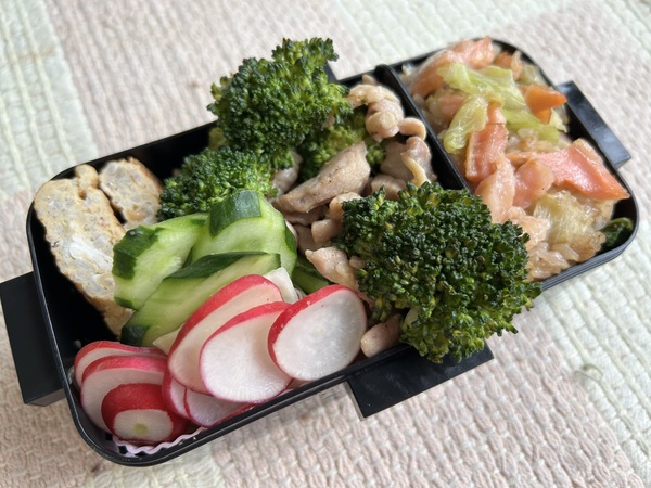 鮭チャーハン、チキンとブロッコリーの炒め物、玉子焼き