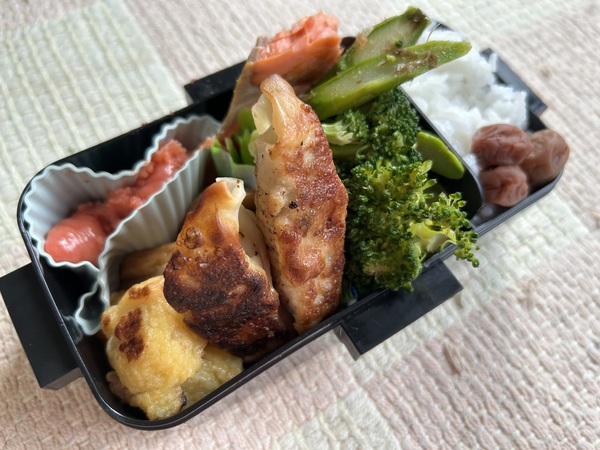 アスパラとブロッコリーの和物、塩鮭、明太子、焼き餃子