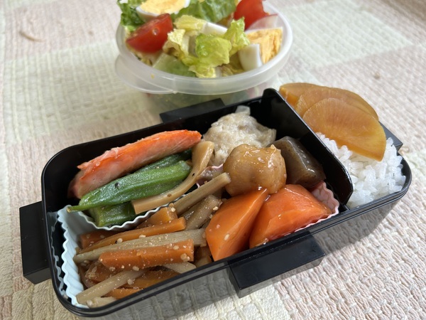 きんぴら、里芋とにんじんの煮物、オクラの和物、サラダ