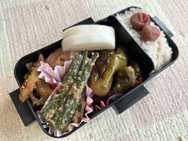 オクラの胡麻和え、肉詰めピーマン、牛蒡の甘唐揚げ