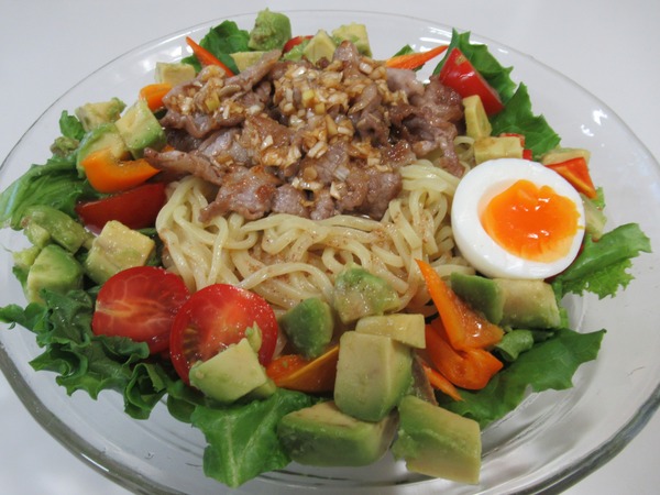 今日の麺料理は「カリカリ豚とアボカドのサラダ冷やし中華」です