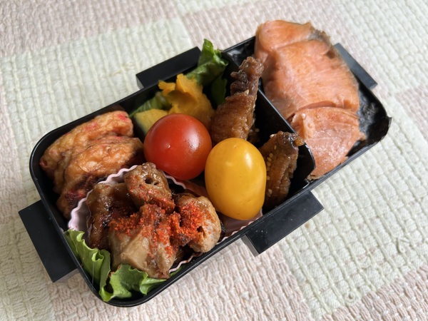 鮭、チキンの照り焼き、カボチャ