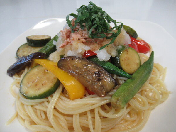今日の麺料理は「夏野菜の和風マリネとツナおろしの冷たいパスタ」です