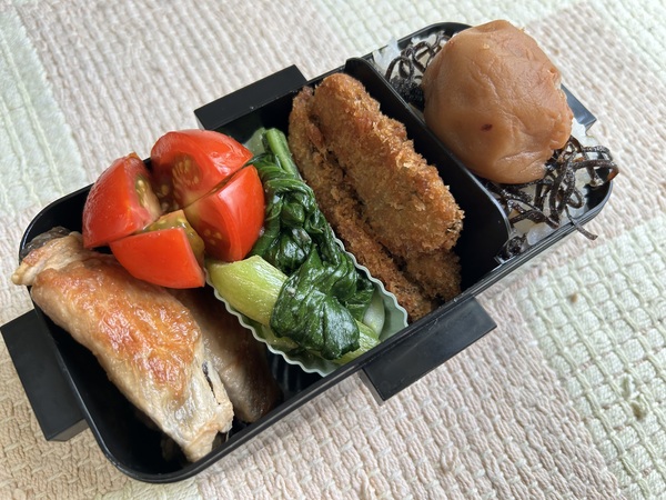 ナスの豚肉巻き、秋刀魚フライ、青梗菜炒め、紀州海