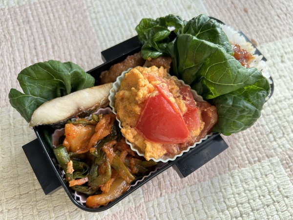 豚キムチ炒め、トマ玉炒め、塩サバ、
