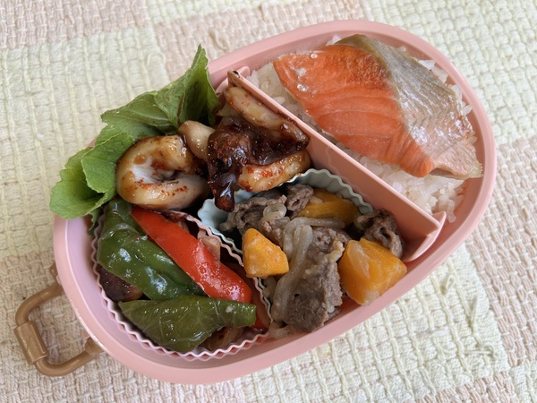 イカの照り焼き、肉じゃが、野菜炒め、塩鮭