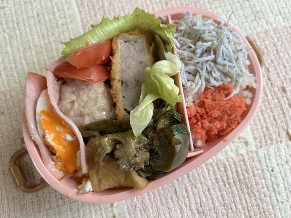 ハムエッグ、ナスと厚揚げの煮物、牛肉コロッケ、焼売