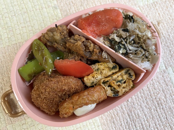 コロッケ、舞茸フライ、卵焼き、ピーマン炒め
