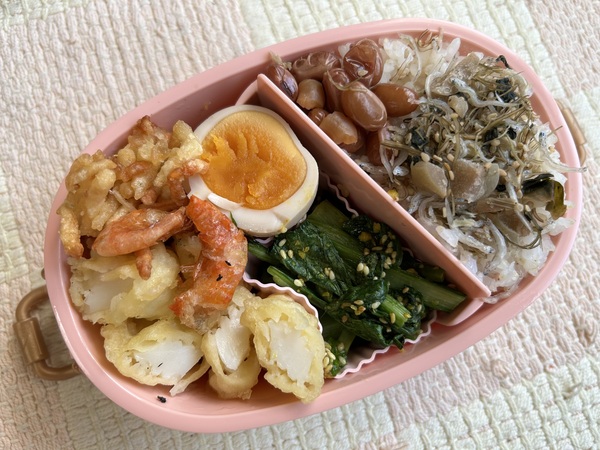 かき揚げ、イカ天、小松菜の辛子和え、煮卵