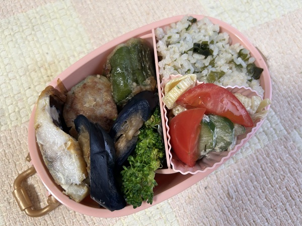 わかめご飯、塩サバ、肉詰めピーマン、ブロッコリーのおかか和え
