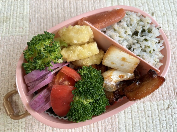 鶏の照り焼き、イカの天ぷら、わかめご飯