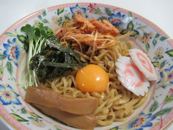 今日の麺料理は超簡単麺料理。「ねぎチャーシュー釜玉ラーメン」です