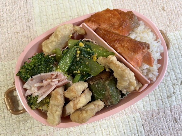とり天、小松菜のカラシ和え、肉詰めピーマン