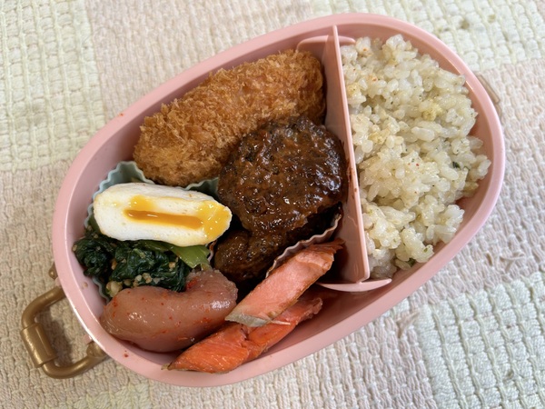 カニクリームコロッケ、ハンバーグ、小松菜のピーナッツ和え